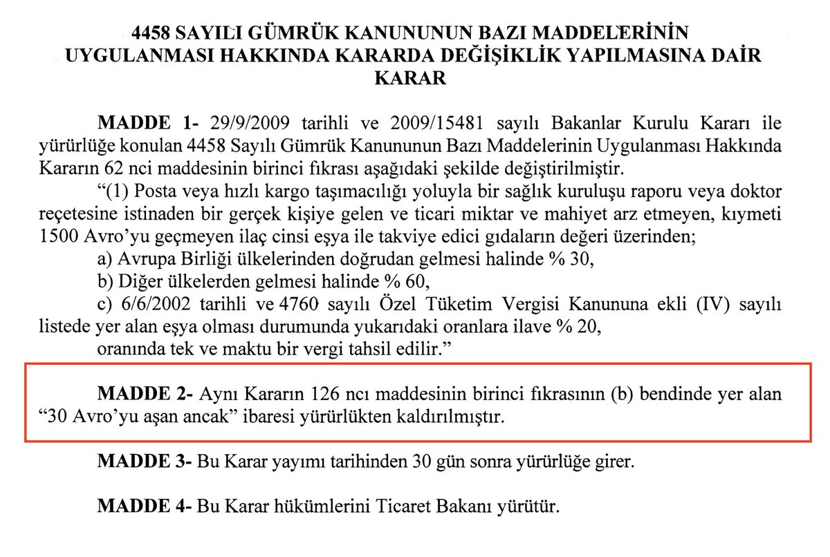 Karar, 4458 Sayılı Gümrük Kanunu’nun 126. hususunun birinci fıkrasını yürürlükten kaldırarak, 30 Euro’ya kadar olan eşyaların posta yahut kargo yoluyla gümrüksüz getirilmesi uygulamasına son verdi.