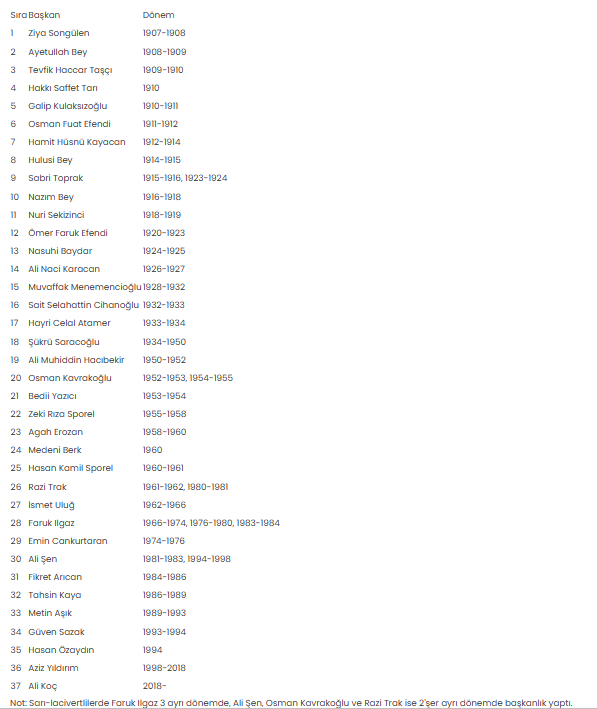 Fenerbahçe Kulübünün tarihinde başkanlık yapanlar ve vazife aldıkları devir şöyle: