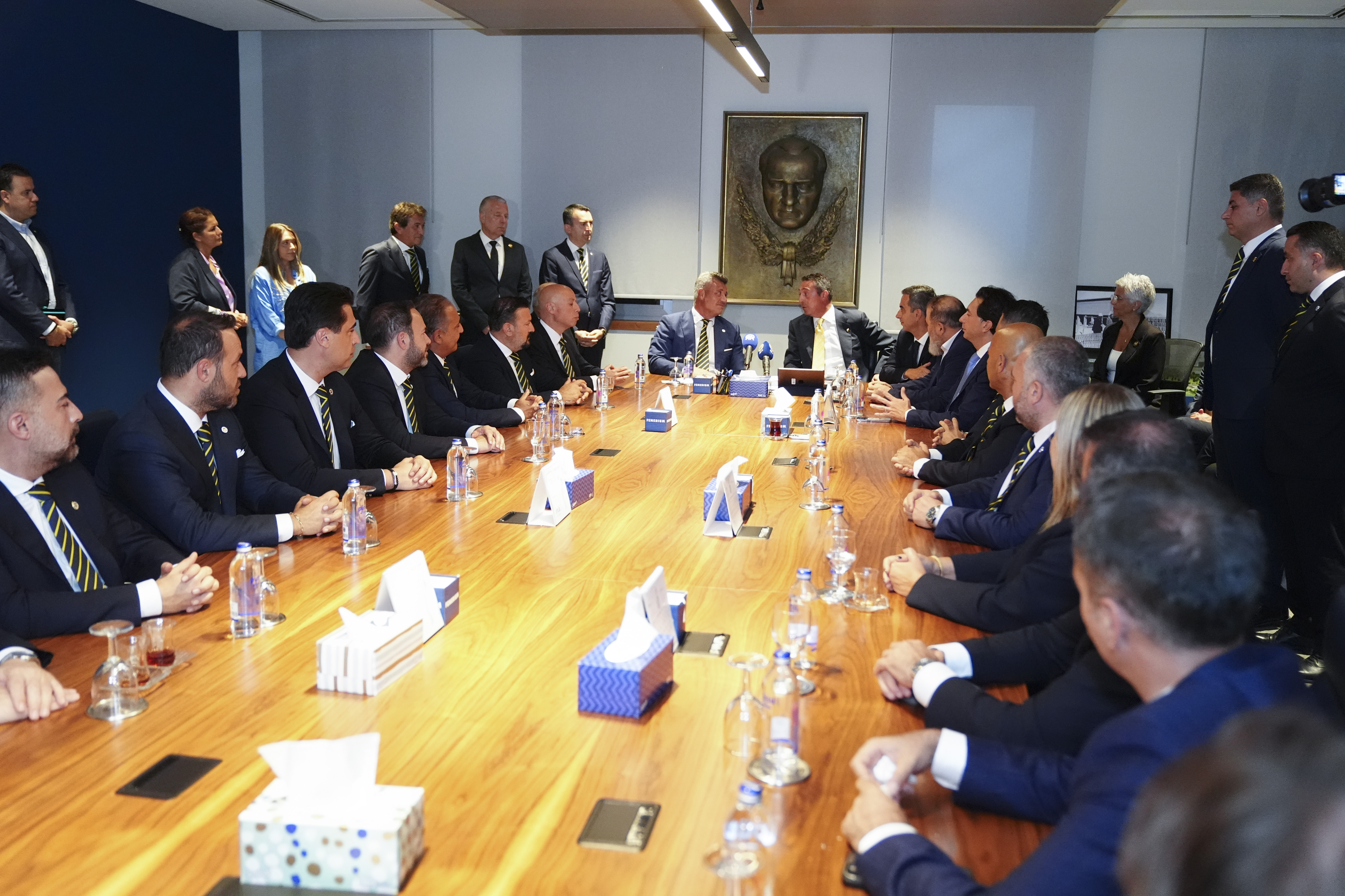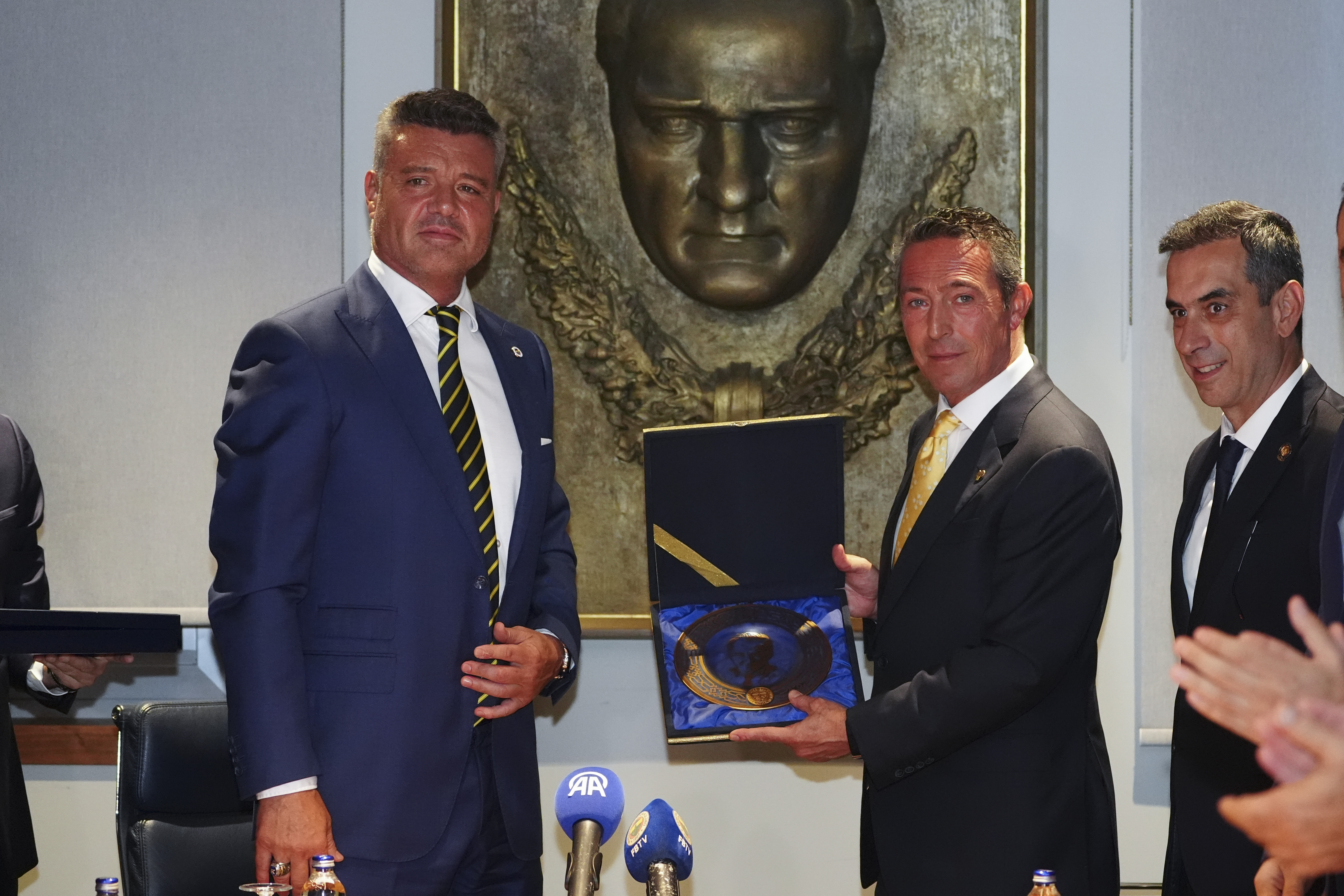Açıklamaların ardından Fenerbahçe Başkanı Sadettin Saran, eski lider Ali Koç’a plaket takdim etti.