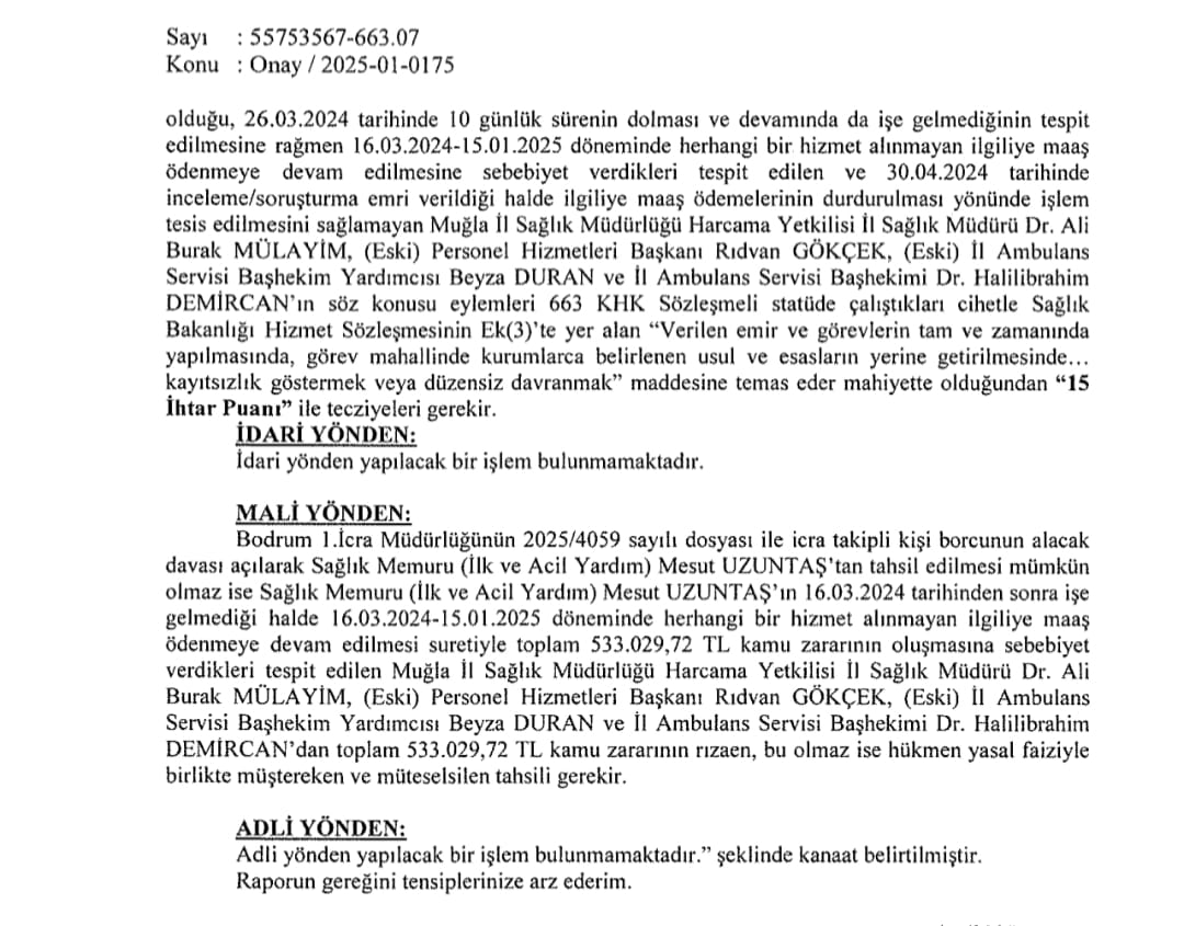 Maaş ödemeleri, Uzuntaş’ın vazifesine gelmediği halde icra talebiyle ortaya çıkmıştı. Bakanlık raporunda ihmali bulunan yöneticilere “15 ihtar puanı” cezası da verildi.