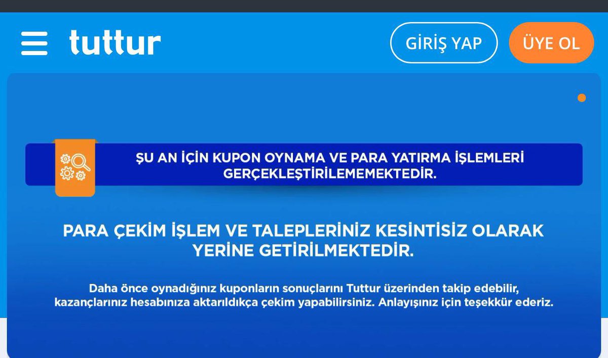 “Şu an için kupon oynama ve para yatrıma süreçleri gerçekleştirilememektedir. Para çekim süreç ve talepleriniz kesintisiz olarak yerine getirilmektedir. Daha evvel oynadığınız kuponların sonuçlarını Tuttur üzerinden takip edebilir, çıkarlarınız hesaplarınıza aktarıldıkça çekim yapabilirsiniz. Anlayışınız için teşekkür ederiz.”