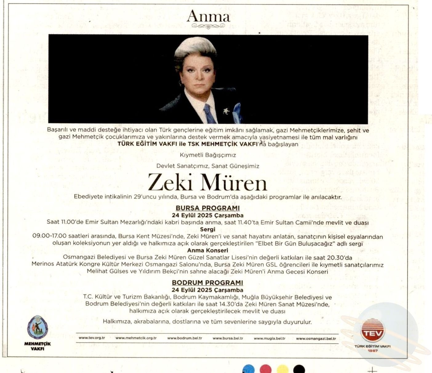 Türk Eğitim Vakfı ve Mehmetçik Vakfı, 24 Eylül 1996’da ortamızdan ayrılan “Sanat Güneşi” Zeki Müren’i unutmamışlardı. Yarın Bursa’da ve Bodrum’da yapılacak “anma” günü ile ilgili aktiflikleri duyurmuşlardı.