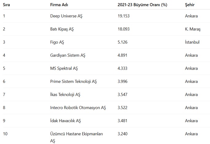 Cirosunu iki yılda yüzde 19 bin 153 oranında artıran Ankara merkezli Deeptech Universe Savunma ve Bilişim Teknolojileri AŞ birinci sırayı aldı.